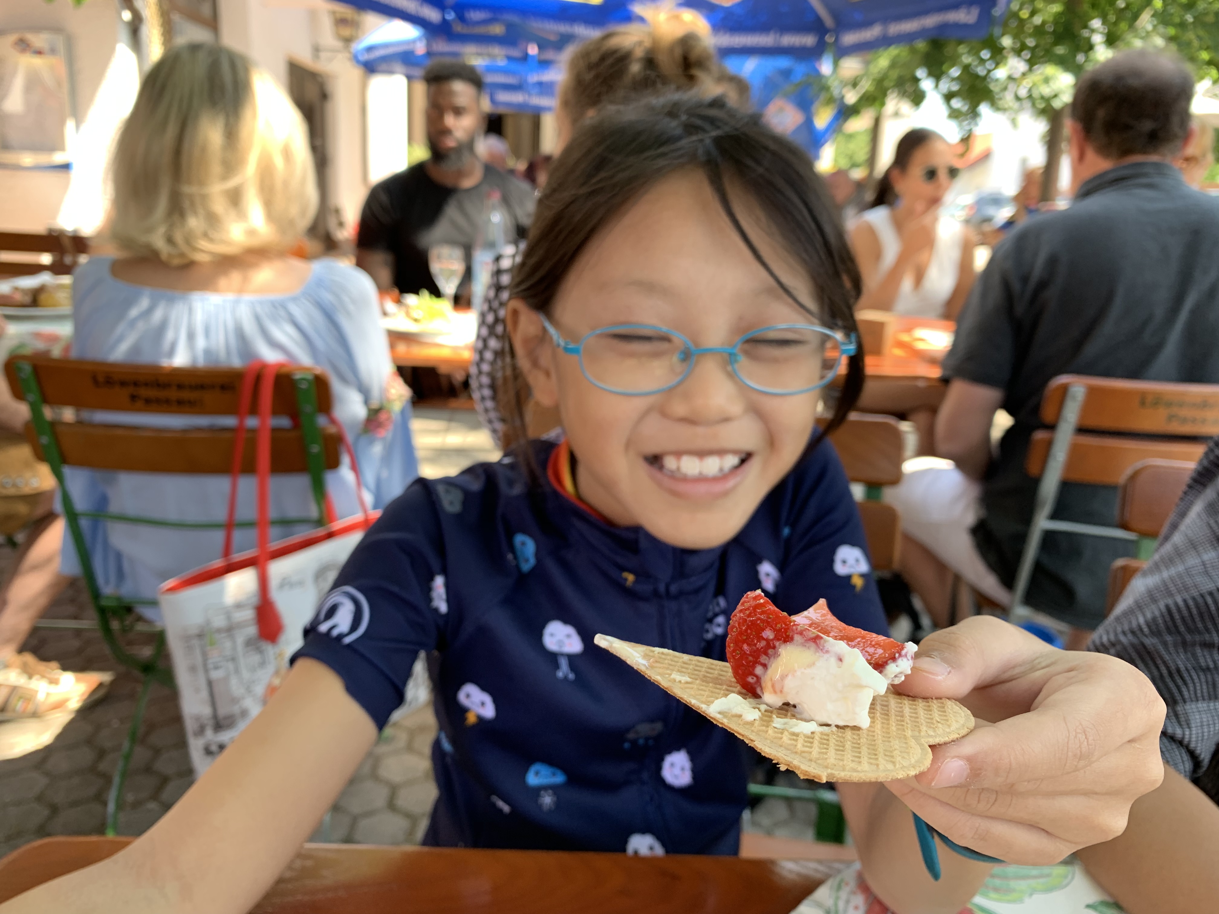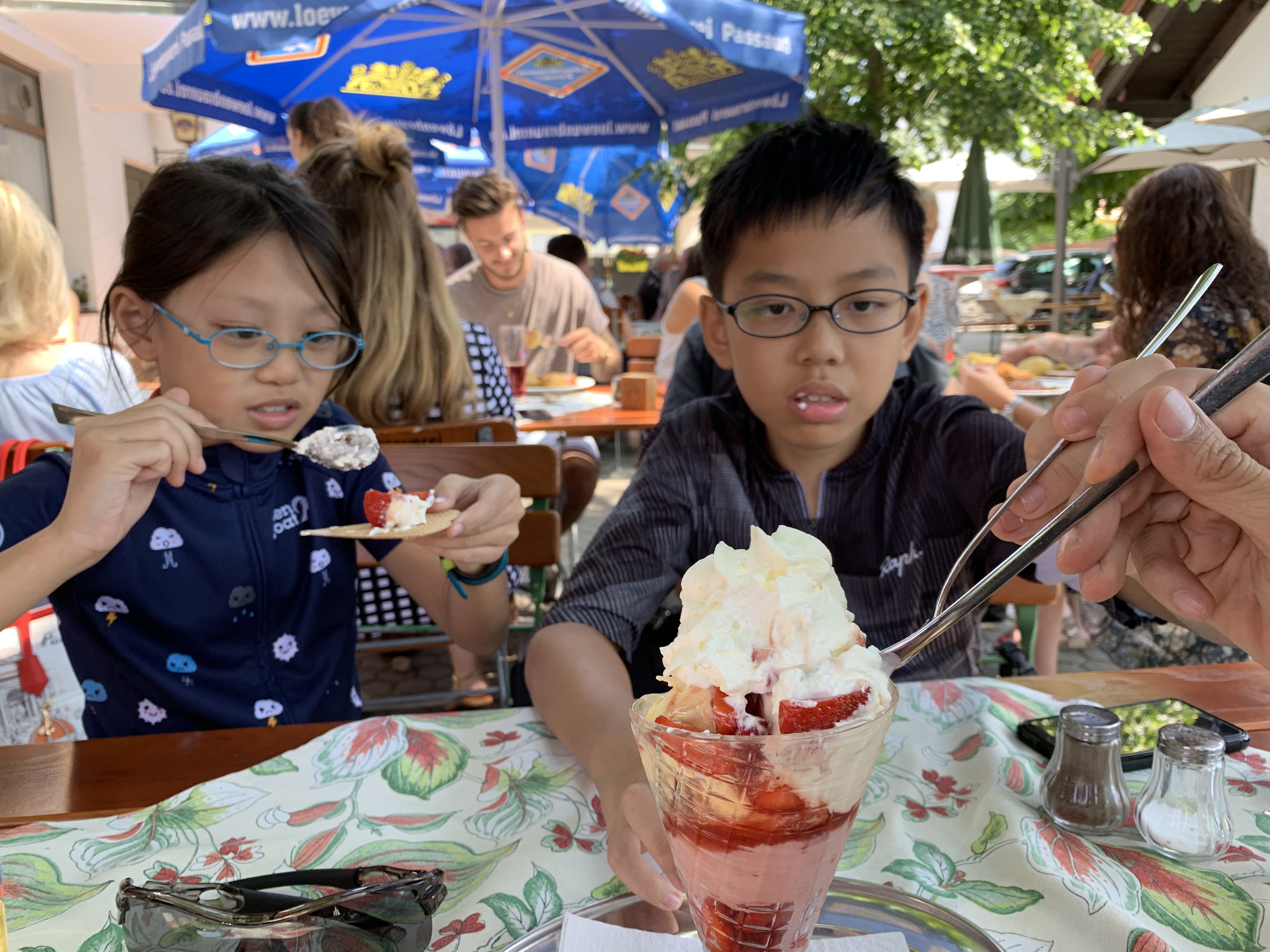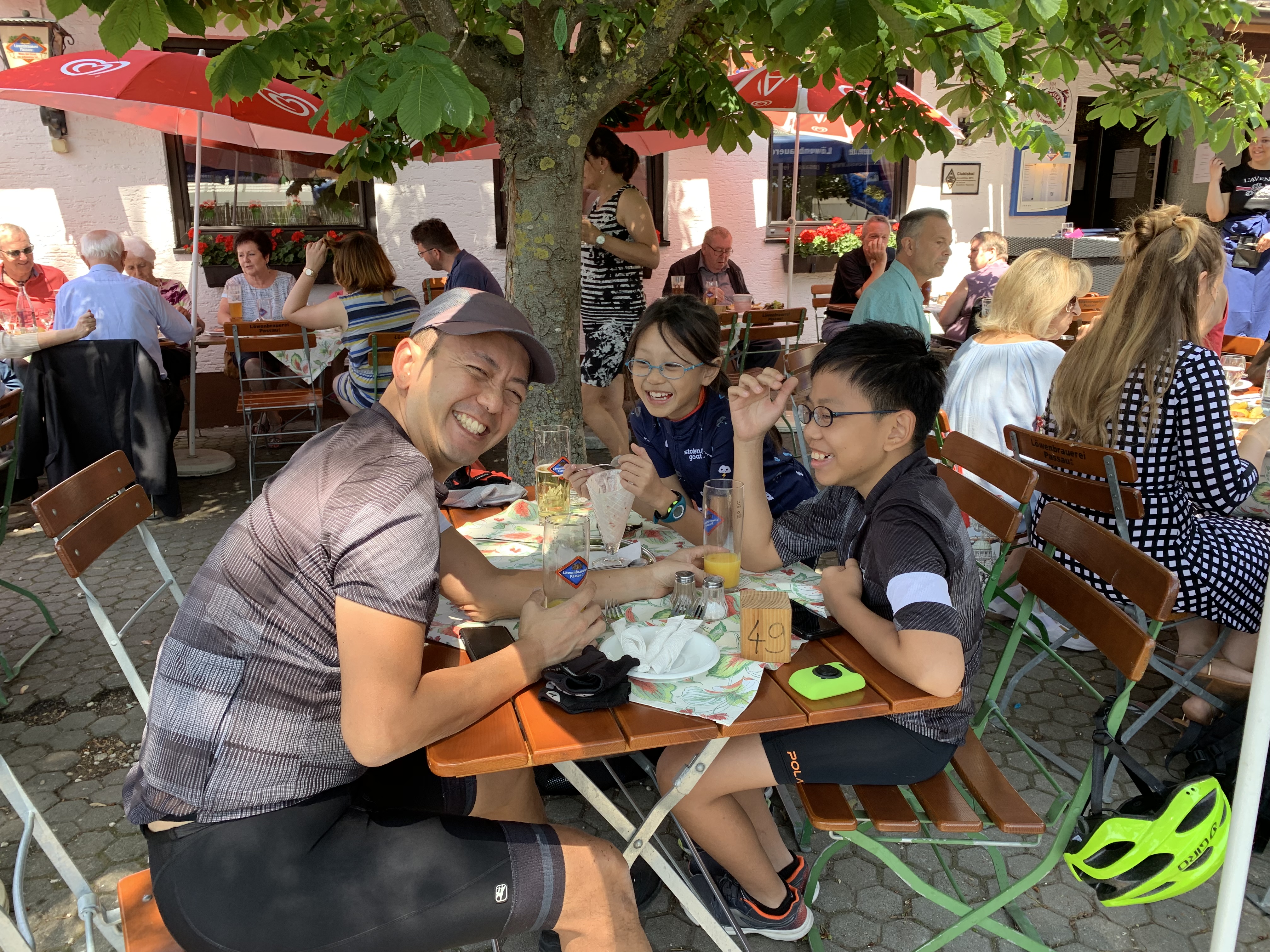 Our bike fuel is 100% biodegradable and friendly to the environment (most of the time!) Its early summer and strawberries & cherries are in season now! A refreshing break in our ride. Some very happy meals here! The pretzel came straight out of the oven and was soooo goooood!