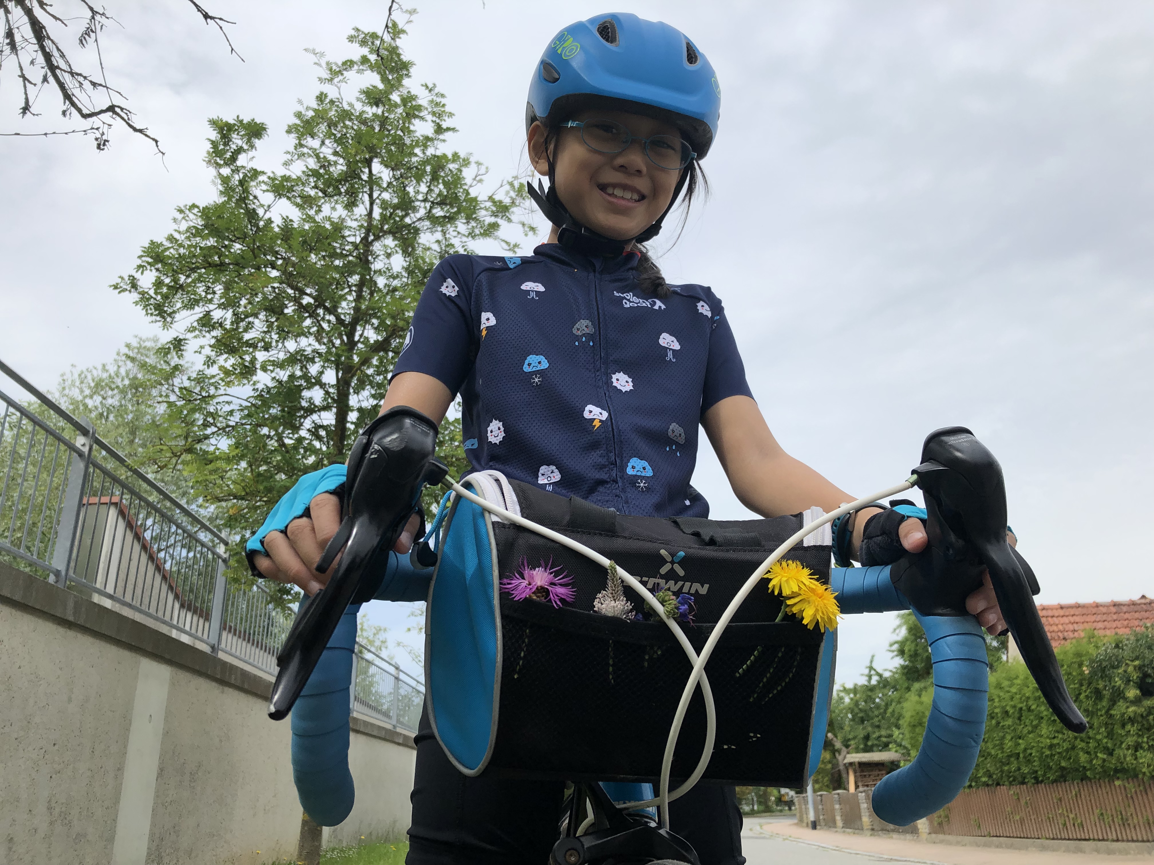 Talia loves to pick wild flowers and decorate her handlebar bag as we go along! Very cute!!