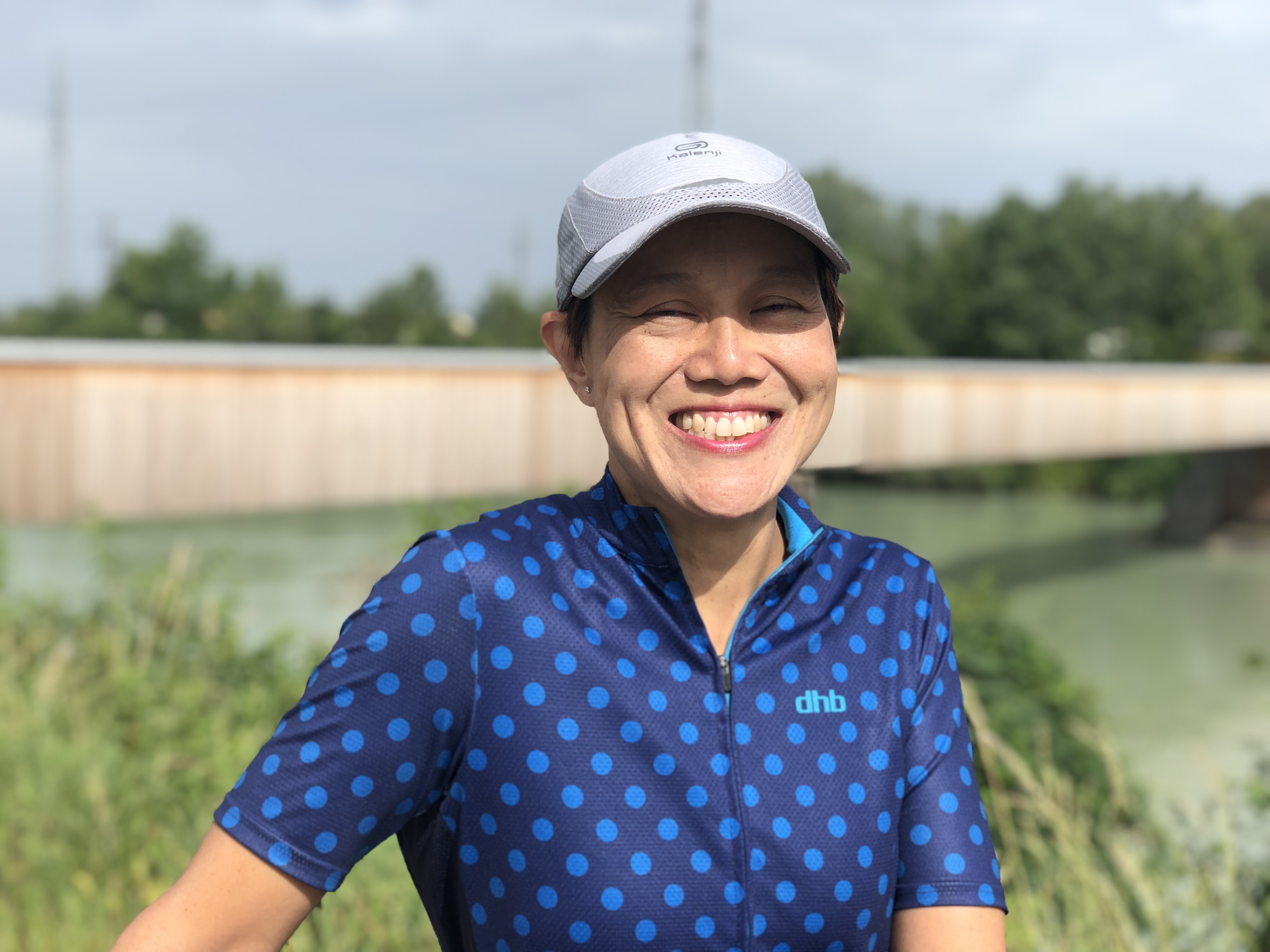 Renata smiled happily for a photo in front of the new wooden bridge!